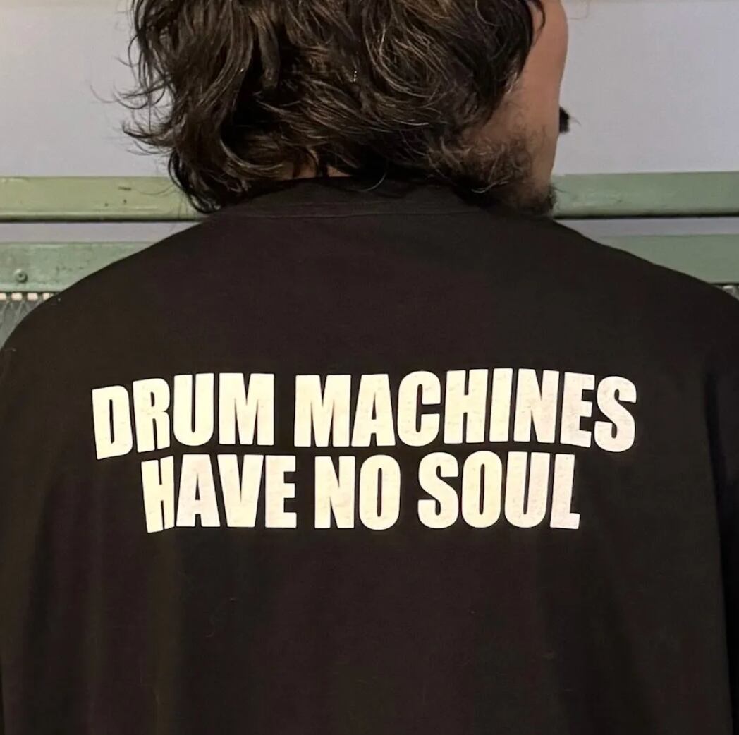 彼が演奏に使うMacbook Proに貼っていたのが、皮肉とユーモアあふれる「DRUM MACHINE HAVE NO SOUL」と書かれたステッカーでした。